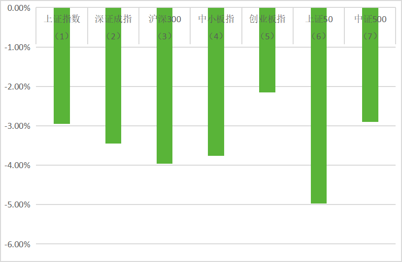 全周上证指数-2.95%,深成指-3.45%,创业板指数-2.15%。盘面环保、通信、国防军工、电力设备和交通运输等涨幅居前,建筑材料、非银金融、食品饮料、美容护理和轻工制造等表现较差。